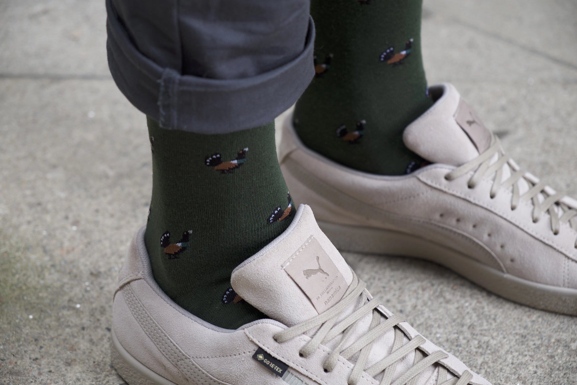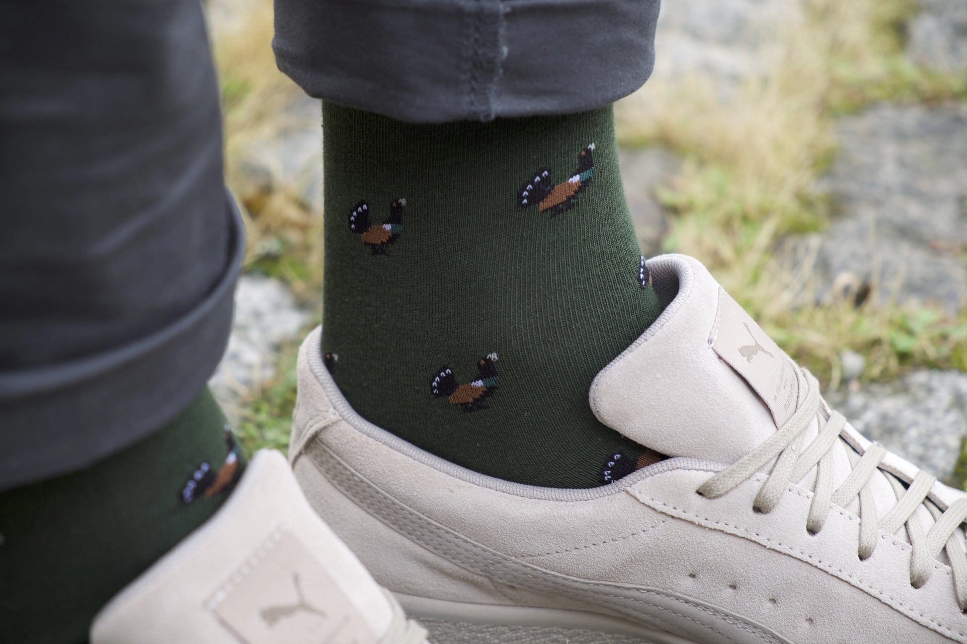 Celebrate the Scottish Highlands with these delightful, dark green cotton socks. The wee Capercaillies, woven into the socks, showcase the native grouse's iconic plumage and proud stance.